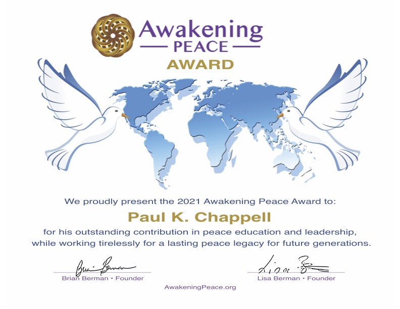 Our fourth Awakening Peace Award recipient was selected in 2021 is Paul K. Chappell, and the Peace Literacy Institute.