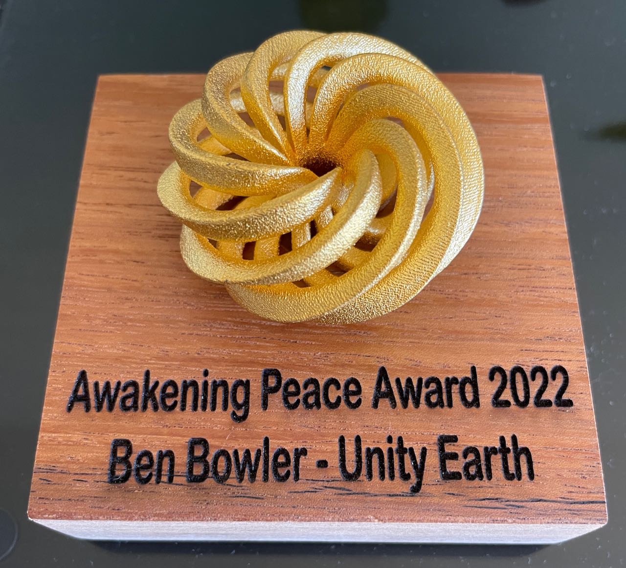 This Awakening Peace Award is a 3D metal printed sculpture which symbolizes our unity as One Humanity. It is recognized globally as a 3 dimensional peace symbol.